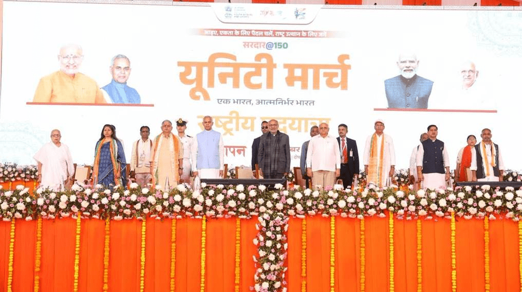 The grand culmination ceremony of the Sardar@150 Unity March at the Statue of Unity was graced by an esteemed gathering of national and state leaders. Shri C. P. Radhakrishnan, Vice President of India, presided over the event, joined by Shri Devendra Fadnavis, Chief Minister of Maharashtra; Shri Acharya Devvrat, Governor of Gujarat; Dr. Mansukh Mandaviya, Union Minister of Youth Affairs & Sports and Labour & Employment; Shri Bhupendrabhai Patel, Chief Minister of Gujarat; Shri Tokhan Sahu, Union Minister of State for Housing and Urban Affairs; Shri Rajiv Ranjan Singh, Union Minister of Panchayati Raj and Fisheries, Animal Husbandry & Dairying; Smt. Raksha Khadse, Union Minister of State for Youth Affairs & Sports & Several other prominent leaders and senior officials were also present, reflecting the national importance of the occasion and lending further gravitas to the conclusion of the march.