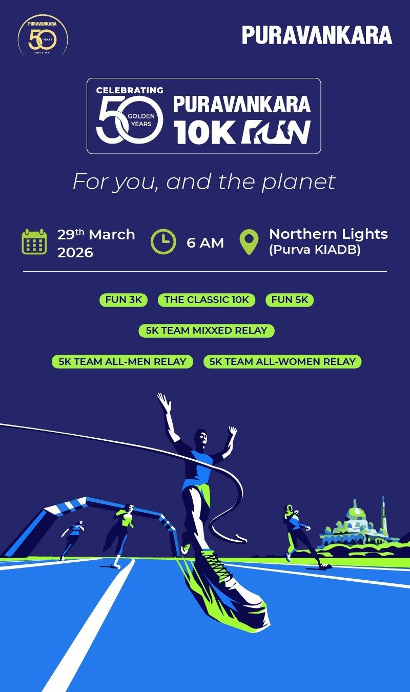 Celebrate fitness and community spirit at the Puravankara 10K Run, marking 50 golden years of Puravankara. Set to take place at the Northern Lights in Puravankara (Purva KIADB), Bengaluru, the run brings together enthusiasts for an energising morning dedicated to wellness and sustainability.